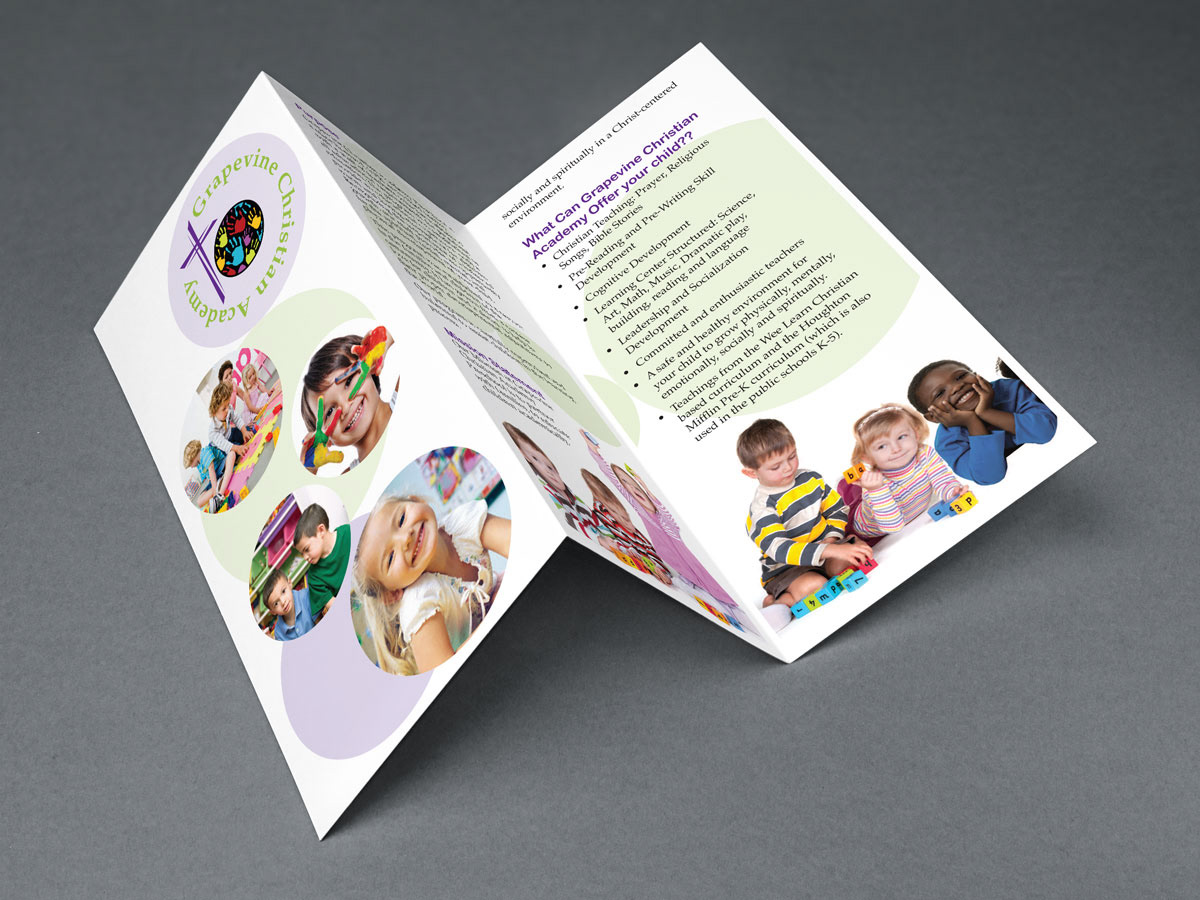 Trifold brochure for a preschool. Included business cards, direct mail, website design and custom photos